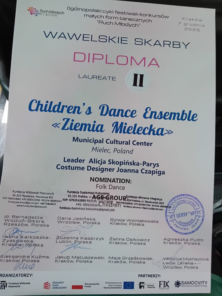 Dwa mieleckie zespoły wróciły z Krakowa z imponującymi trofeami. Dziecięcy Zespół Tańca „Ziemia Mielecka” i ZPiT „Mali Rzeszowiacy” z sukcesem podjęły rywalizację z 30 innymi w Międzynarodowym Konkursie i Festiwalu Folkloru, Tańca i Muzyki „Wawelskie skarby”. II miejsce wywalczył zespół „Ziemia Mielecka”, a III – „Mali Rzeszowiacy”. Mieleckie zespoły, które szlifują swoje umiejętności w Domu Kultury SCK, rywalizowały z grupami z Polski (m.in. Kraków, Szczecin, Kutno) i zza granicy (Węgry, Ukraina). Mielczan wyprzedził tylko zespół z Kutna.