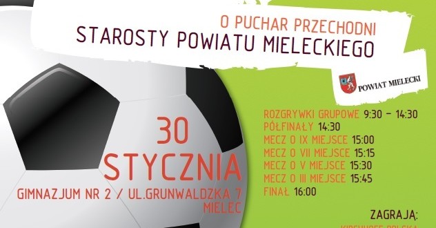 Starostwo Powiatowe w Mielcu, Kirchhoff Polska, PZL Mielec oraz LEAR Mielec serdecznie zapraszają mieszkańców powiatu mieleckiego do kibicowania w „V Noworocznym Turnieju Piłkarskim o Puchar Przechodni Starosty Mieleckiego”, który odbędzie się w dniu 30 stycznia 2016 roku (sobota) na hali sportowej Gimnazjum Nr. 2 w Mielcu (ul. Grunwaldzka 7).