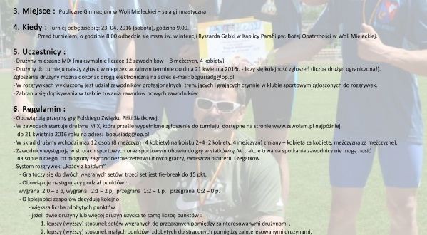 Organizatorzy zapraszają 23 kwietnia 2016 roku do wzięcia udziału w Turnieju OPEN Piłki Siatkowej MIX o Puchar Prezesa Uczniowskiego Klubu Sportowego ”Start” Wola Mielecka w ramach I Memoriału im. Ryszarda Gąbki „Moi Uczniowie” Kwiecień – 2016