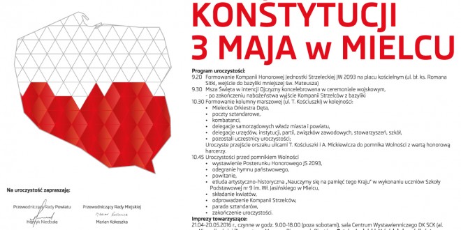 Zaproszenie na obchody Narodowego Święta Konstytucji 3 Maja w Mielcu – szczegóły na plakacie