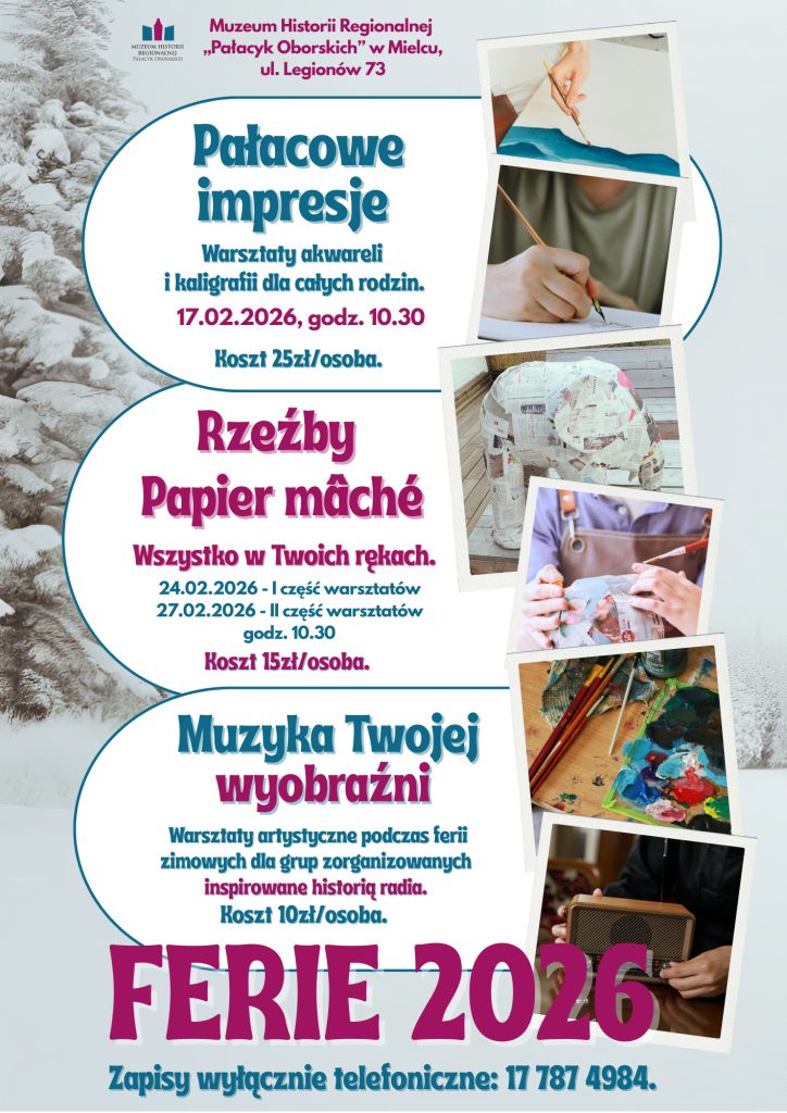 Regulamin zajęć dostępny na stronie https://www.muzeum.mielec.pl/aktualnosc-1640-ferie_2026_w_palacyku_oborskich.html?fbclid=IwY2xjawP32sdleHRuA2FlbQIxMABicmlkETA5RlB3ZFpVRFVlQ0s5am1Qc3J0YwZhcHBfaWQQMjIyMDM5MTc4ODIwMDg5MgABHtM7ITnYI71hlMagELMY1_O06Ht1ptCpo93AhP8rEJ2P17cDqzSowVvFJJ59_aem_H20V3an9y1ZtPfOCo1Eu3w