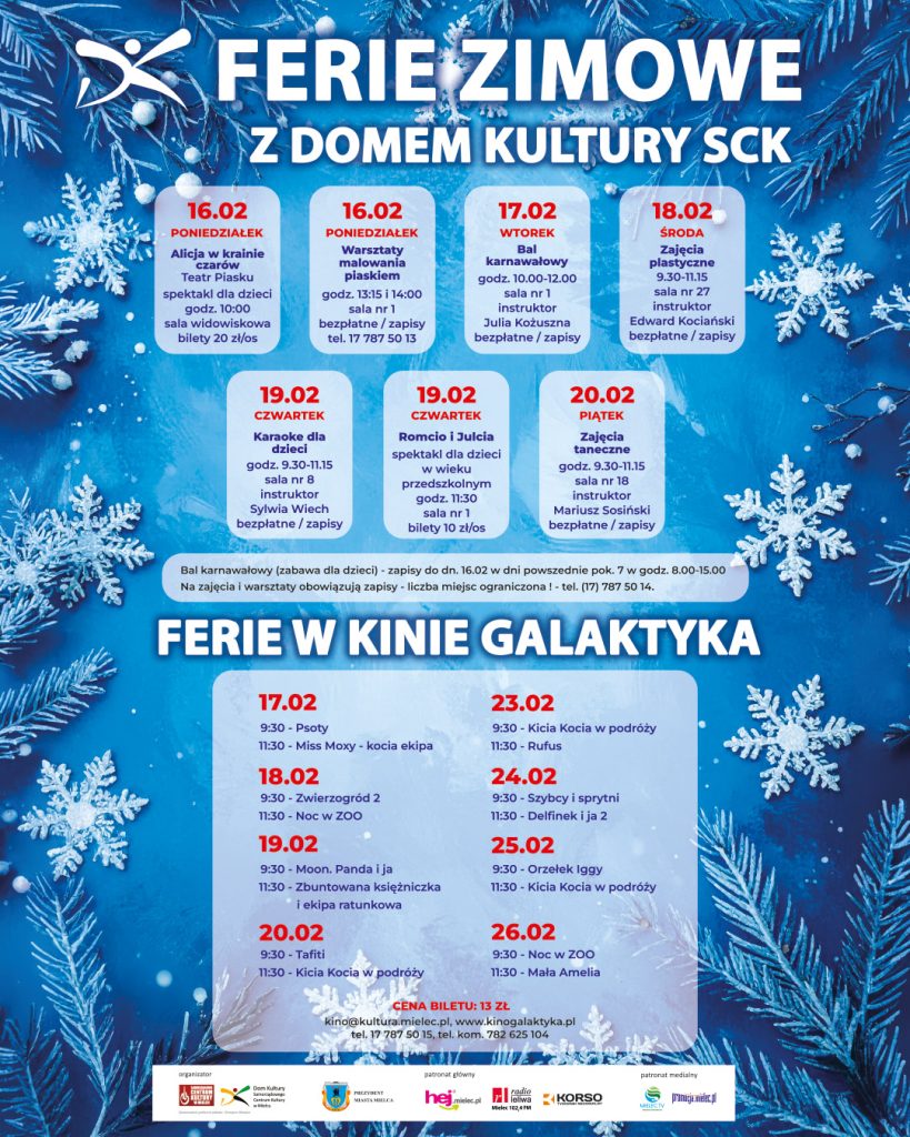Zapraszamy dzieci i młodzież do aktywnego i kreatywnego spędzenia ferii zimowych w Domu Kultury SCK oraz Kinie Galaktyka! Przygotowaliśmy różnorodny program artystyczny i rekreacyjny, prowadzony przez doświadczonych instruktorów i zaproszone zespoły 🎭🎨🎬