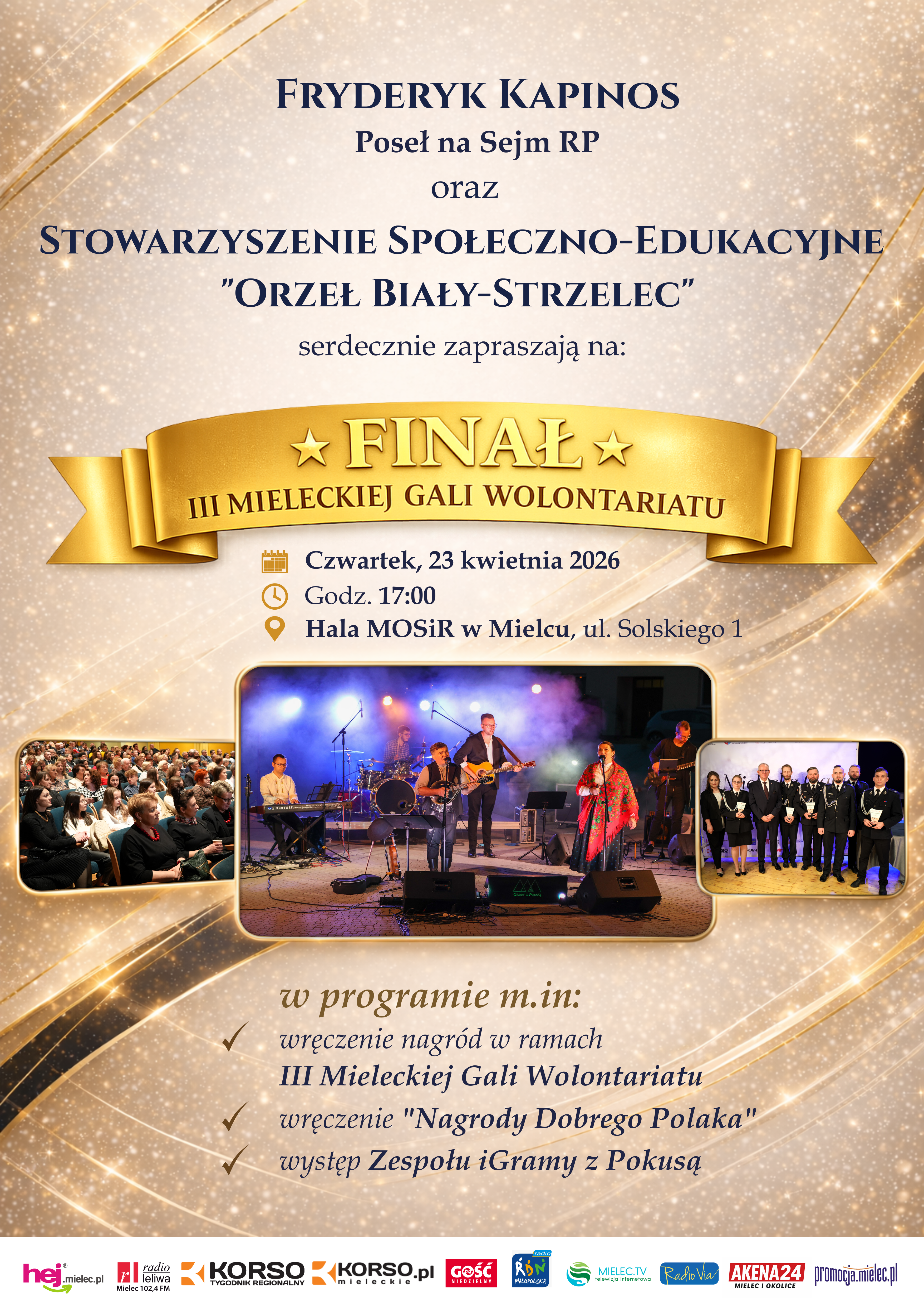 Finały dwóch dotychczasowych edycji odbyły się w Domu Kultury SCK w Mielcu. – Zmiana lokalizacji Finału Gali niesie ze sobą dodatkowe wyzwania jednak jestem przekonany, że podobnie jak to było w Domu Kultury, tak również w Hali MOSiR panować będzie znakomita atmosfera – mówi Poseł Kapinos.– Zapraszamy wolontariuszy z rodzinami, przyjaciółmi, znajomymi. Zapraszamy wszystkich, którzy chcą być uczestnikami tego prawdziwego święta wolontariatu – zachęca Poseł Fryderyk Kapinos.