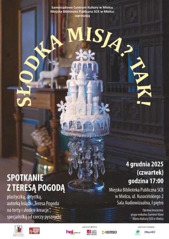 „Słodka misja? Tak”! – spotkanie z Teresą Pogodą – 4 grudnia, godz. 17, Sala Audiowizualna MBP SCK w Mielcu, ul. Kusocińskiego 2, I piętro.