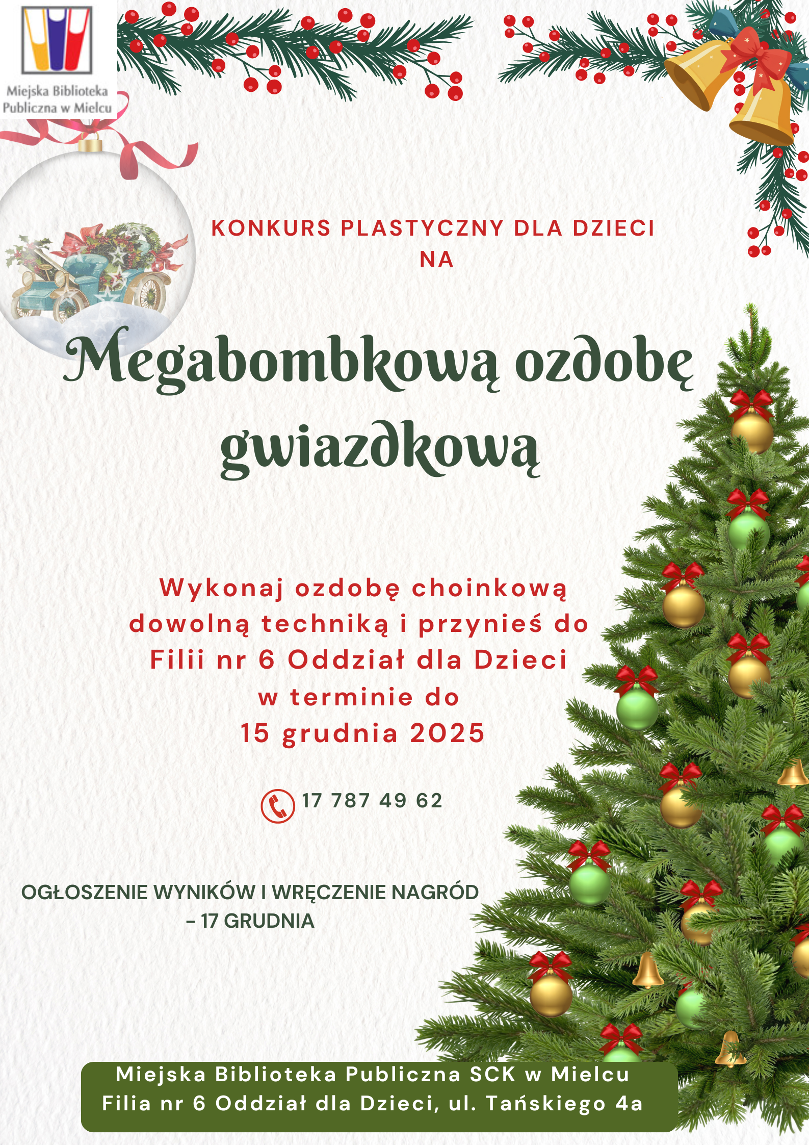 Konkurs plastyczny w Filii nr 6 Oddziale dla dzieci na wykonanie „Megabombkowej ozdoby gwiazdkowej”- prace należy dostarczyć do 15 grudnia 2025 w siedzibie Filii przy ul. Tańskiego 4a. Ogłoszenie wyników 19 grudnia 2025 roku.