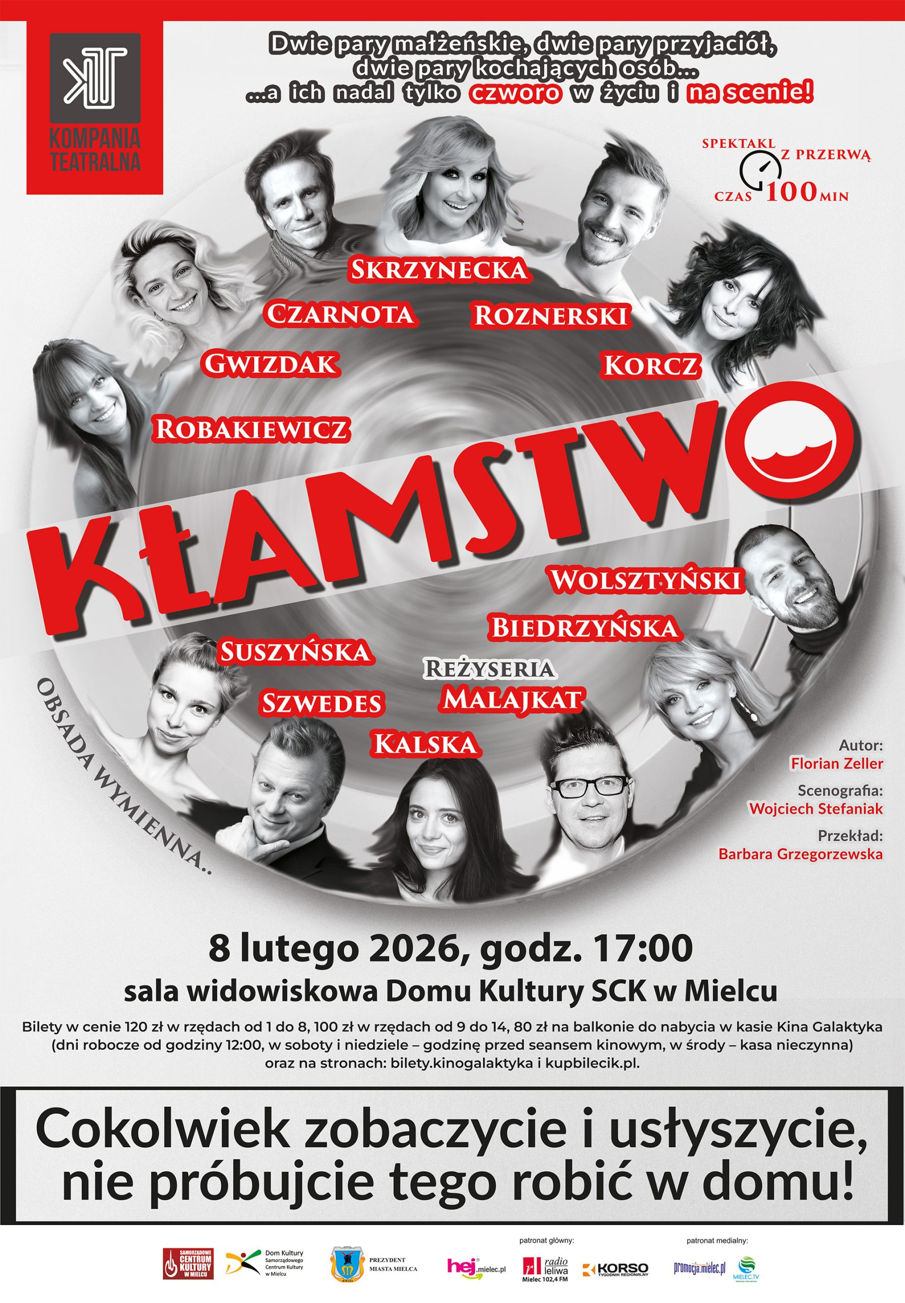 „KŁAMSTWO” to przenikliwe i zabawne studium… kłamstwa właśnie. Florian Zeller, francuski dramaturg, z gracją porusza się po zakamarkach ludzkich umysłów. Autor wie sporo o związkach damsko-męskich i o… kłamstwach, które spróbował zweryfikować w warunkach scenicznych. Udało mu się to na tyle, że w całej Europie widzowie podczas przedstawień podobno spadają z krzeseł z rozbawienia. Producent spektaklu, Piotr Szwedes, przekonuje, że spektaklu nie można traktować jako instruktażu kłamania i że spektakl jest nie tylko lekką, błyskotliwą komedią, ale i sztuką z cennym przekazem.