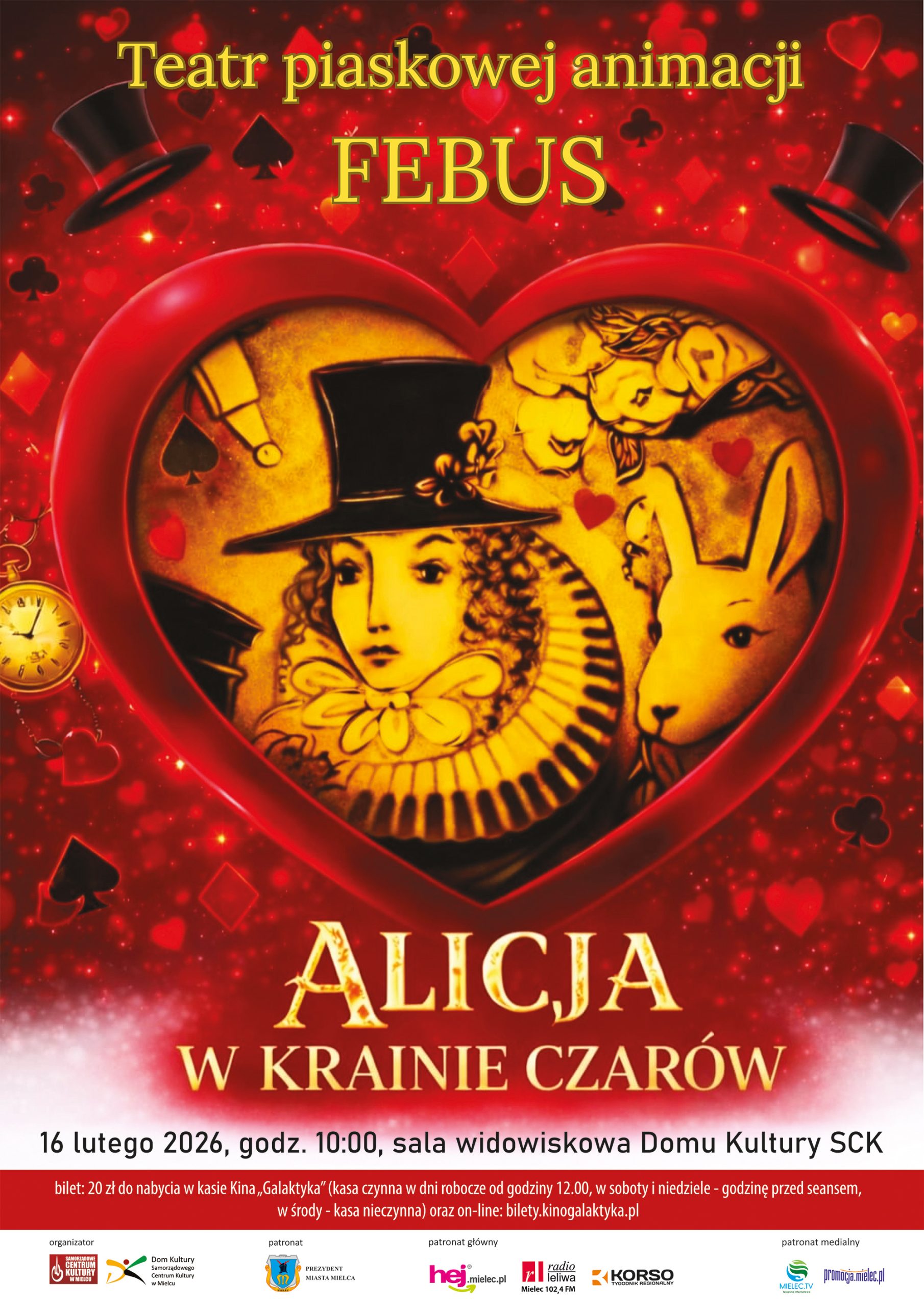 „Alicja w Krainie Czarów” w wykonaniu Teatru Piaskowej Animacji „Febus” to spektakl, w którym historia opowiadana jest poprzez malowanie piaskiem. Obrazy tworzone są na szklanym stole, a następnie wyświetlane na ekranie, tworząc unikalne, dynamiczne widowisko łączące sztukę wizualną z muzyką i narracją. Spektakle te oferują magiczną atmosferę, przenosząc klasyczną opowieść Lewis Carrolla w zupełnie nowy, artystyczny wymiar.