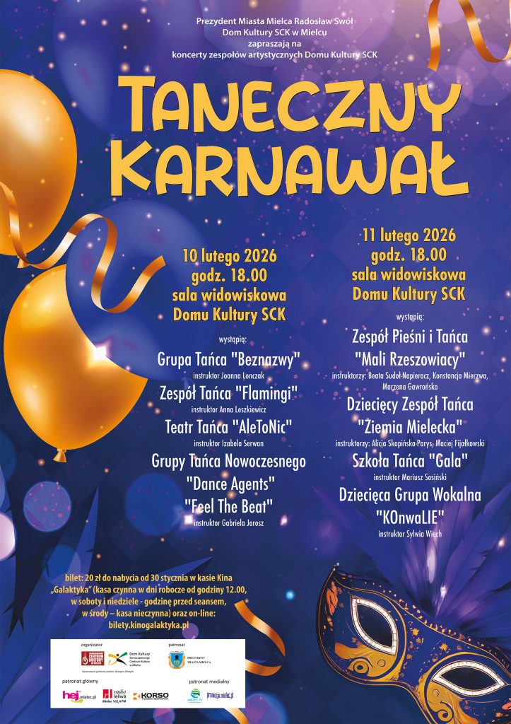 Koncerty karnawałowe dziecięcych zespołów artystycznych – zespoły tańca nowoczesnego oraz hip-hop – 10 lutego, godz. 18.00, sala widowiskowa Domu Kultury SCK.