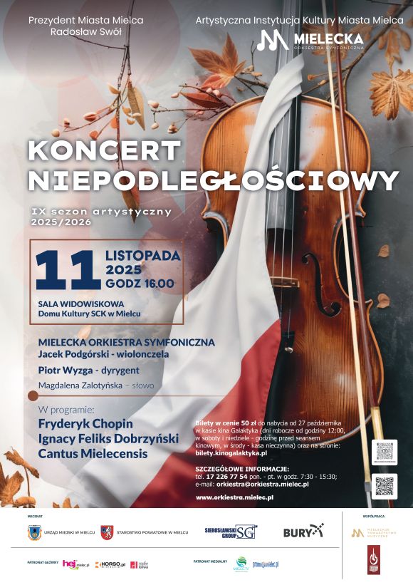 XIX Międzynarodowy Konkurs Pianistyczny imienia Fryderyka Chopina oblekł artystyczny rok 2025 w brzmieniowe szaty najwybitniejszego rodzimego muzyka. Fakt ten nie pozostanie również bez wpływu na przebieg Koncertu Niepodległościowego symfoników mieleckich. „Chopiniana” – korowód najbardziej reprezentatywnych dzieł mistrza w wydaniu orkiestrowym stanie się dominantą repertuaru wydarzenia, który uzupełniony kompozycjami kolejnego krajowego wirtuoza Ignacego Feliksa Dobrzyńskiego oraz tradycyjnym już CantusMielecensis zapewnić powinien niezapomniane patriotyczno – estetyczne wrażenia