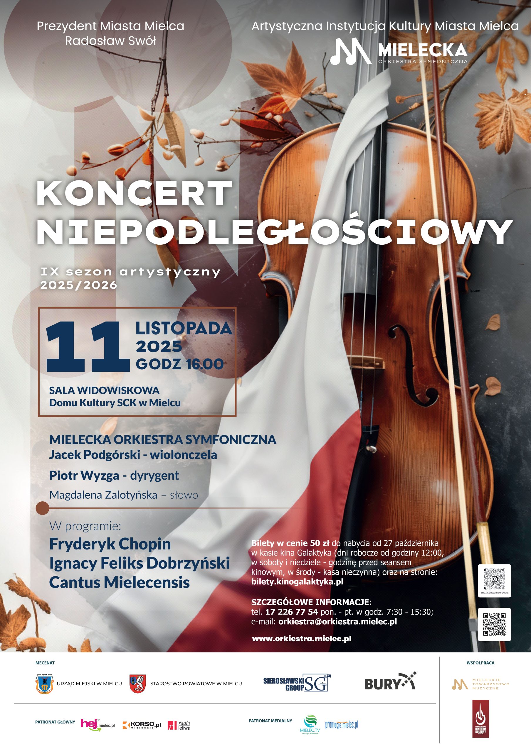 XIX Międzynarodowy Konkurs Pianistyczny imienia Fryderyka Chopina oblekł artystyczny rok 2025 w brzmieniowe szaty najwybitniejszego rodzimego muzyka. Fakt ten nie pozostanie również bez wpływu na przebieg zaplanowanego na 11 listopada o godz. 16.00 w Domu Kultury SCK Koncertu Niepodległościowego symfoników mieleckich. „Chopiniana” – korowód najbardziej reprezentatywnych dzieł mistrza w wydaniu orkiestrowym stanie się dominantą repertuaru wydarzenia, który uzupełniony kompozycjami kolejnego krajowego wirtuoza Ignacego Feliksa Dobrzyńskiego oraz tradycyjnym już Cantus Mielecensis zapewnić powinien niezapomniane patriotyczno – estetyczne wrażenia.