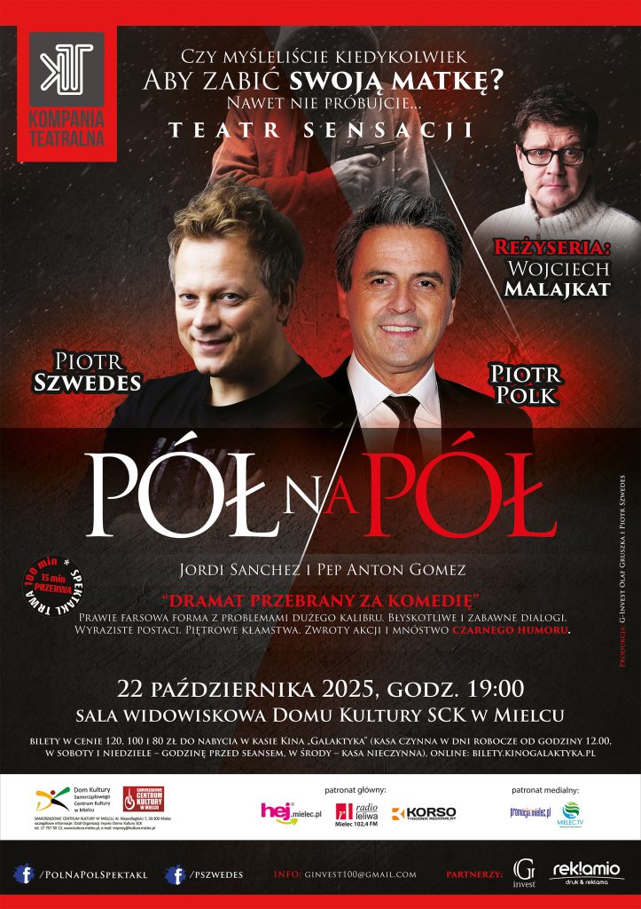 Spektakl „Pół na pół” w reżyserii Wojciecha Malajkata z Piotrem Polkiem i Piotrem Szwedesem – 22 października, godz. 19, sala widowiskowa DK SCK.