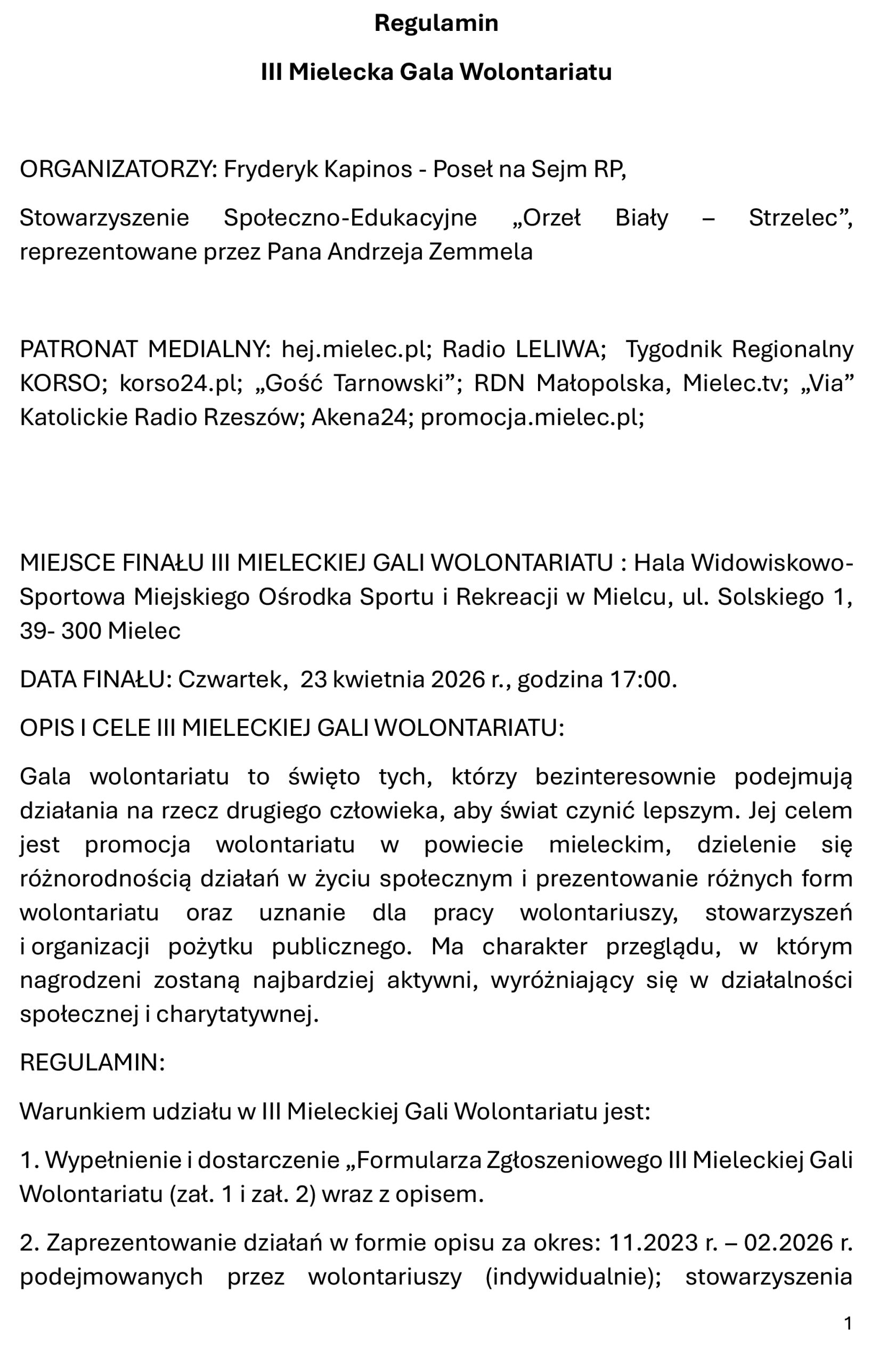 Warunkiem uczestnictwa w III Mieleckiej Gali Wolontariatu jest wypełnienie formularza zgłoszeniowego, który należy dostarczyć w wersji papierowej do Biura Poselskiego Fryderyka Kapinosa przy ul. Obrońców Pokoju 6 w Mielcu, do dnia 16 marca br.