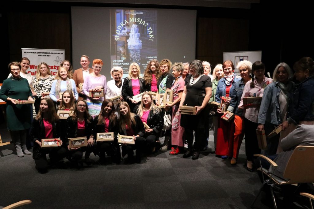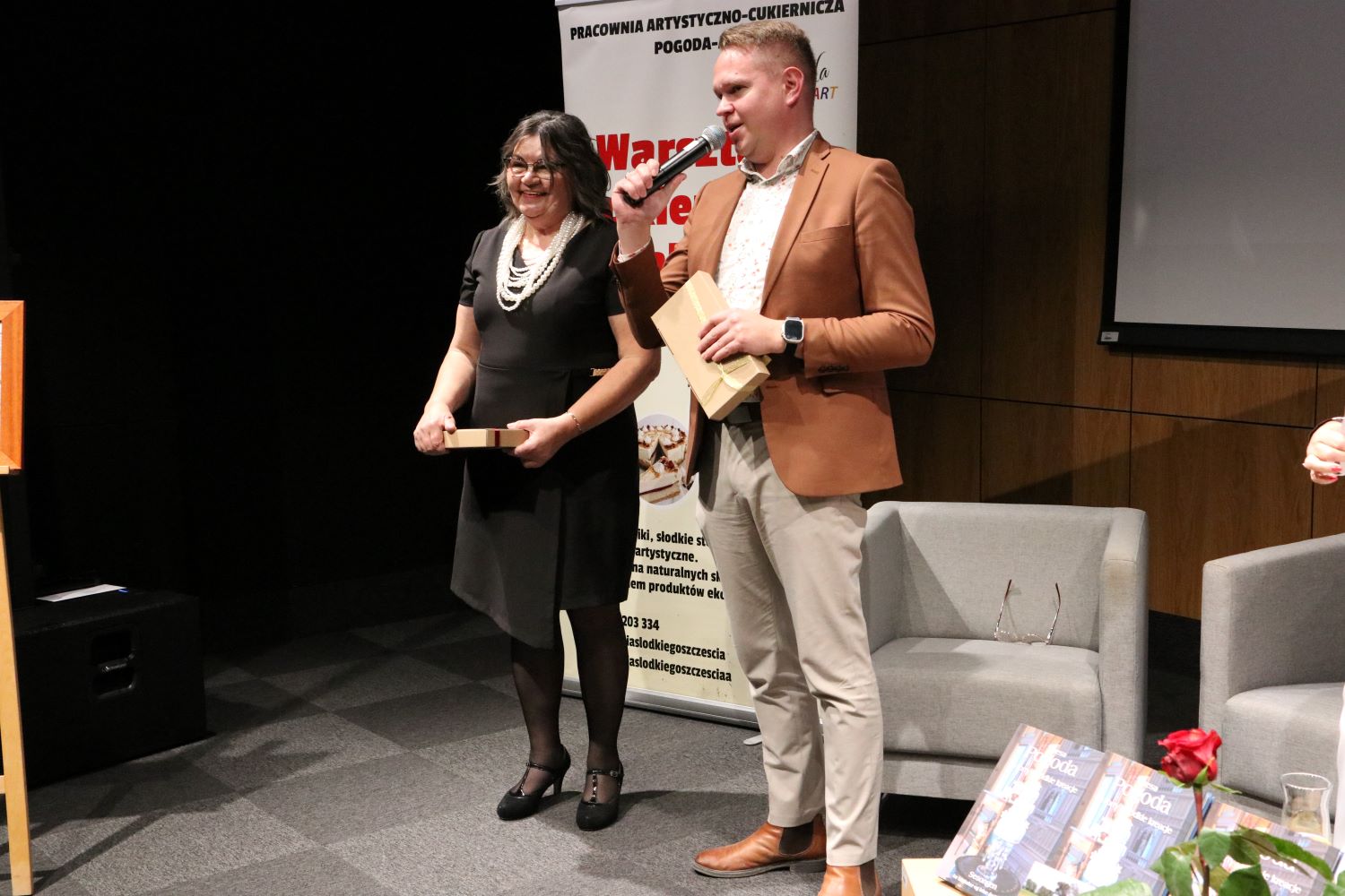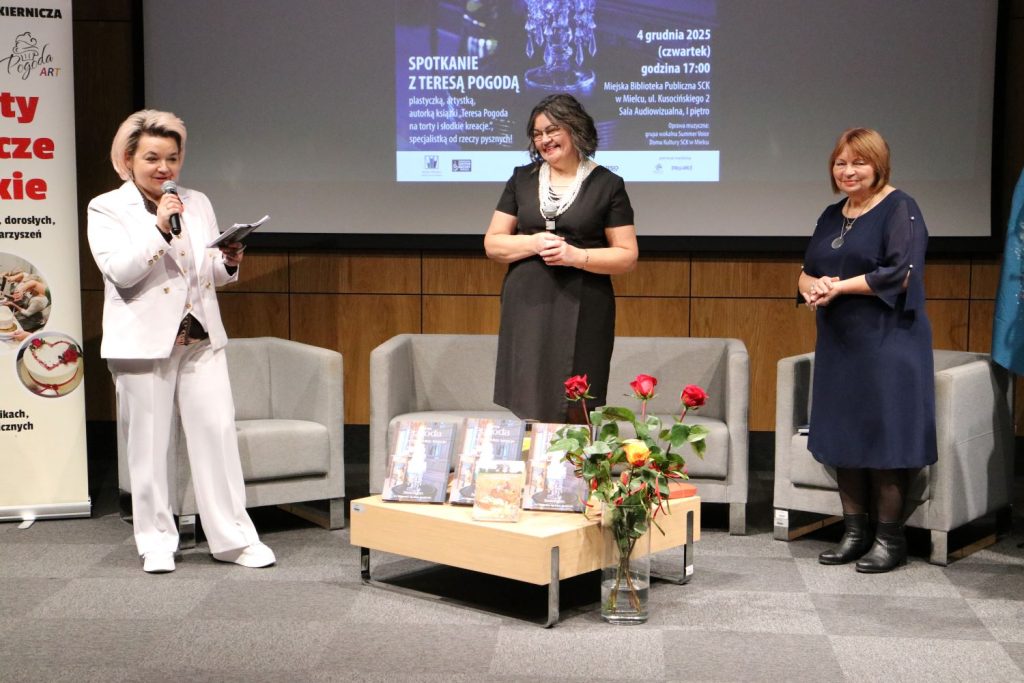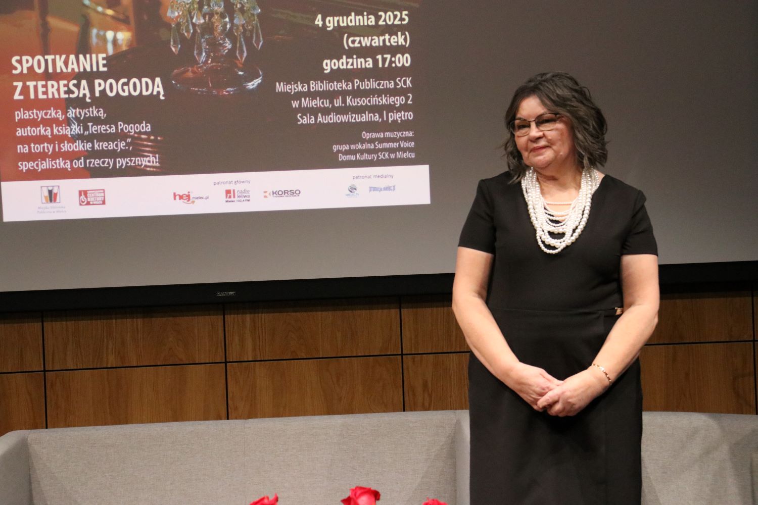 Spotkanie z Teresą Pogodą, artystką, autorką książki, a przede wszystkim wspaniałą cukierniczką, która liczenie tortów przez siebie upieczonych zarzuciła po przekroczeniu liczby 3 tysięcy, przyciągnęło 4 grudnia do Miejskiej Bibliotece Publicznej bardzo liczną publiczność. O Teresie Pogodzie wiele miłych słów powiedziała Agata Ćwięka, która poprowadziła spotkanie, przepytując bohaterkę wieczoru o jej dwie pasje: malarstwo i… pieczenie tortów. Teresa Pogoda opowiedziała o początkach swojej cukierniczej kariery, która rozkwitła, gdy mieszkała w Norwegii. Tam szkoliła swoje umiejętności, spędzając wiele godzin na tworzeniu tortów, które były nie tylko małymi dziełami sztuki cukierniczej, ale i plastycznej. Publiczność miała też okazję zobaczyć zdjęcia imponujących wypieków Teresy Pogody. Bohaterka wieczoru opowiadała też o tym, jak po 30 latach od ukończenia Liceum Plastycznego wróciła z sukcesem do malowania. Teraz udanie łączy obie swoje pasje. Spełniła też marzenie o napisaniu książki, której tytuł brzmi „Teresa Pogoda na torty i słodkie kreacje”.
