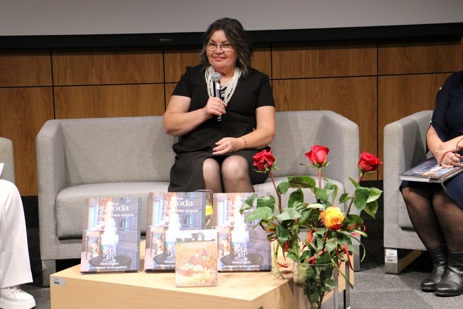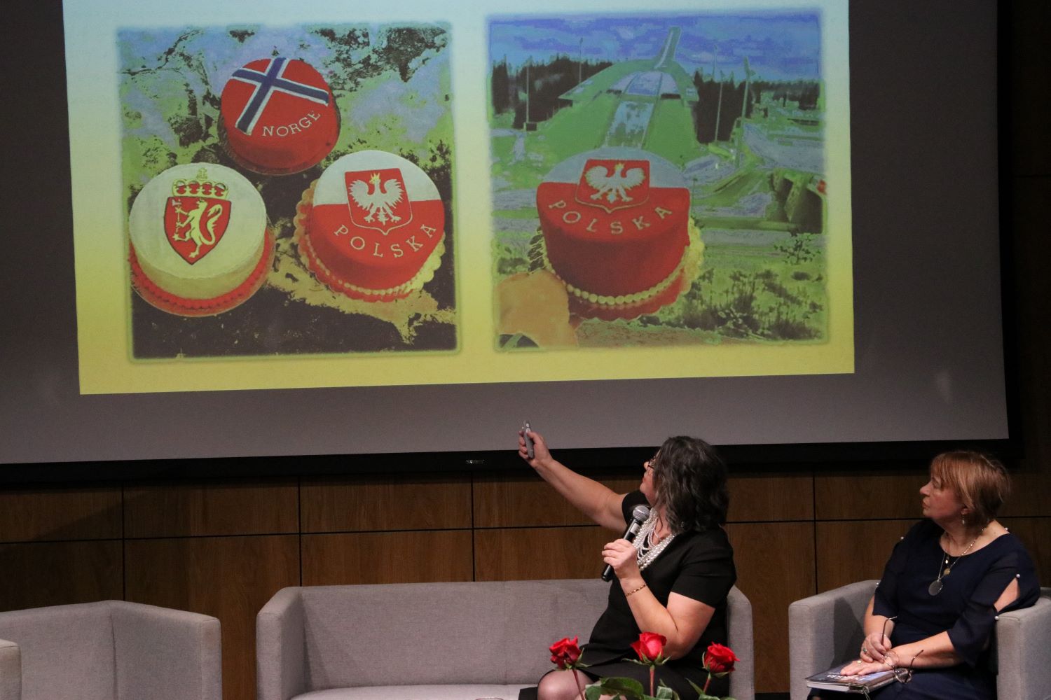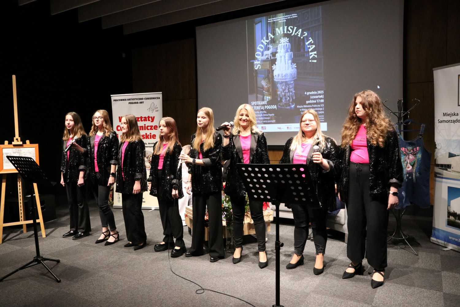 Spotkanie z Teresą Pogodą, artystką, autorką książki, a przede wszystkim wspaniałą cukierniczką, która liczenie tortów przez siebie upieczonych zarzuciła po przekroczeniu liczby 3 tysięcy, przyciągnęło 4 grudnia do Miejskiej Bibliotece Publicznej bardzo liczną publiczność. O Teresie Pogodzie wiele miłych słów powiedziała Agata Ćwięka, która poprowadziła spotkanie, przepytując bohaterkę wieczoru o jej dwie pasje: malarstwo i… pieczenie tortów. Teresa Pogoda opowiedziała o początkach swojej cukierniczej kariery, która rozkwitła, gdy mieszkała w Norwegii. Tam szkoliła swoje umiejętności, spędzając wiele godzin na tworzeniu tortów, które były nie tylko małymi dziełami sztuki cukierniczej, ale i plastycznej. Publiczność miała też okazję zobaczyć zdjęcia imponujących wypieków Teresy Pogody. Bohaterka wieczoru opowiadała też o tym, jak po 30 latach od ukończenia Liceum Plastycznego wróciła z sukcesem do malowania. Teraz udanie łączy obie swoje pasje. Spełniła też marzenie o napisaniu książki, której tytuł brzmi „Teresa Pogoda na torty i słodkie kreacje”.