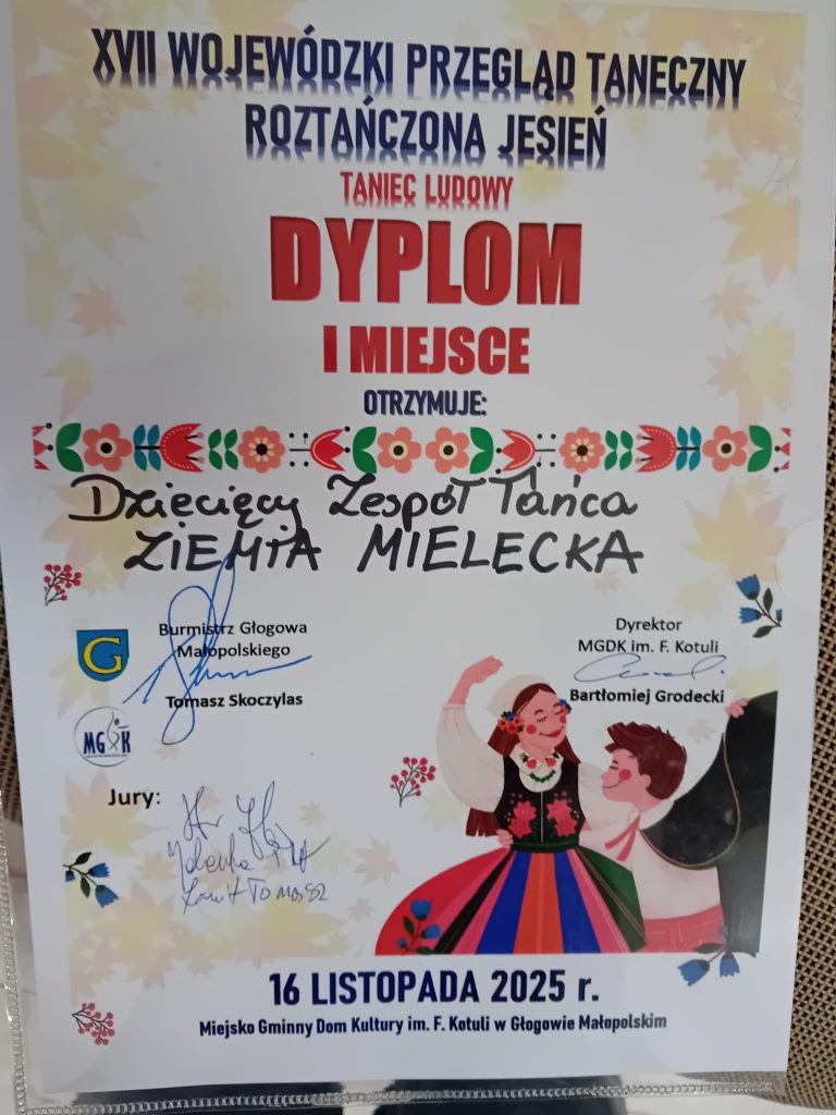 Wielki sukces odnotował zespół „Ziemia Mielecka” z Domu Kultury SCK! Mielczanie jednogłośnie zostali wybrani najlepszym zespołem 17. Wojewódzkiego Przeglądu Tanecznego „Roztańczona jesień”, który odbył się 16 listopada w Głogowie Małopolskim. Zespół prowadzony przez Alicję Skopińską-Parys wygrał w kategorii wiekowej (od 7 do 11 lat).