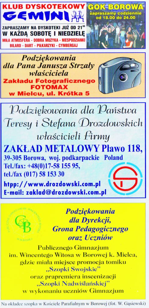 Na przełomie XX i XXI w., począwszy od 1993 r. do 2003 r., kiedy jeszcze autor udzielał się w samorządach gmin, najpierw Borowa, a potem miasta Mielec jako członek Komisji Oświaty i Kultury, sukcesywnie powstawały „szopki swojskie” jego autorstwa. Były to kolejno: „Szopka samorządowa” 1993, „Szopka lokalna” 1995, „Szopka ekologiczna” 1996 i „Szopka Nadwiślańska” 1997 rok. Ukazywały się one na łamach redagowanych przez autora „Wieści Regionalnych”, a w 2003 r. w drukowanej wersji książkowej. W tym samym roku, w lutym „Szopka Nadwiślańska” została wystawiona przez uczniów Publicznego Gimnazjum im. Wincentego Witosa w Borowej. Na inscenizacji i jednocześnie spotkaniu autorskim Włodzimierza Gąsiewskiego obecny był m.in. śp. Leszek Deptuła oraz Wiesław Zieliński ówczesny prezes Związku Literatów Polskich, którego członkiem był autor, Adam Miraś – dyrektor Gimnazjum i wiele innych osób. Wkrótce potem podobna inscenizacja i spotkanie autorskie odbyło się w Centrum Kształcenia Ustawicznego w Rzemieniu. W marcu z kolei takie spotkanie połączone z recytacją wierszy autora miało miejsce w Radomyślu Wielkim.